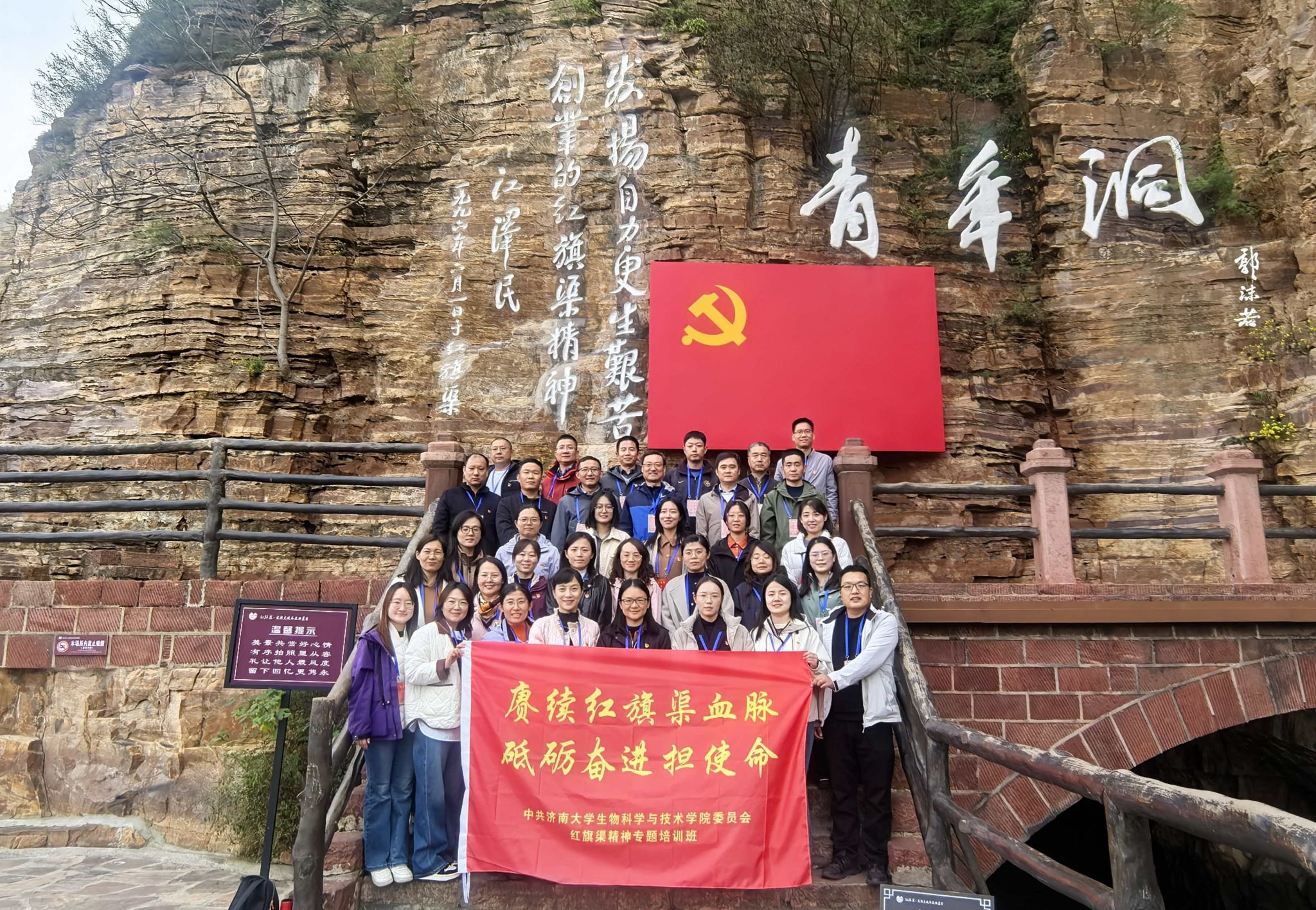 习近平总书记在河南安阳考察时指出:“红旗渠精神同延安精神是一脉相承的,是中华民族不可磨灭的历史记忆,永远震撼人心。”学院一行首先来到红旗渠总干渠上的咽喉工程——青年洞,行走在太行山悬崖峭壁的红旗渠畔,聆听着“劈开太行山,漳河穿山来”的动人故事,实地感受着修建红旗渠所遇到的艰险与挑战,更感受到林县人民齐心协力、劈山凿洞的精神品质。在青年洞前,全体党员驻足凝视峭壁上的凿痕与流淌的渠水,真切体会到“社会主义是拼出来、干出来、拿命换来的”精神内涵,对红旗渠精神的时代价值有了更深刻的认识。
