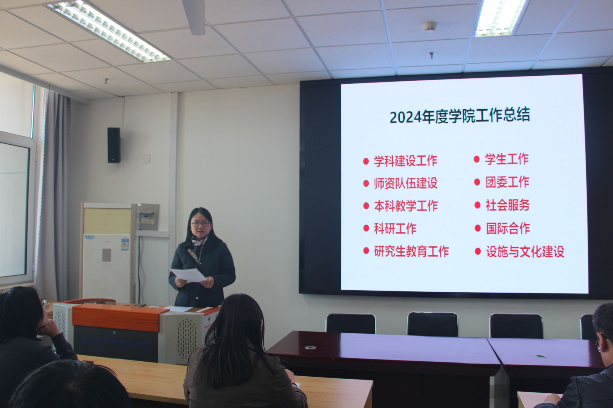 学院院长秦晓春传达了刘宗明校长关于2025年学校重点工作部署要求,通报了2024年学院任务指标完成情况,并详细部署2025年重点工作。她指出,学院将继续推进本科教育审评评估整改工作以及学位点申报工作,进一步加强学科建设,优化师资队伍,提升科研水平,推进开放办学,在学生培养、社会服务等方面持续发力。